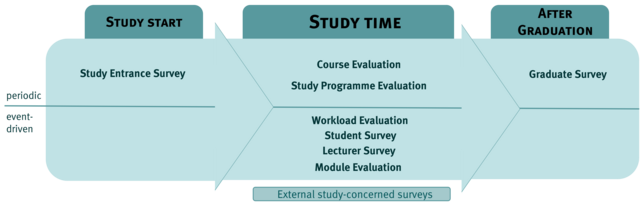 Surveys in the area of studying and teaching are a classic instrument for obtaining an opinion of the student body or teaching staff on certain topics or questions. In addition to course evaluations, surveys are a means of systematically generating information to optimise studies and teaching.