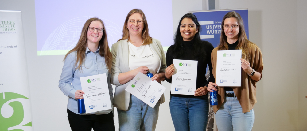 Die Gewinnerinnen des JMU-Vorentscheids der 3 Minute Thesis 2024 (v.l.): Tanja Messingschlager (Publikumspreis), Jennifer Meier, Shriya Mamatha Jayaram (Vizemeisterinnen) und Ann-Kathrin Karl (Gesamtsiegerin). (Bild: Sebastian Hofmann/JMU)