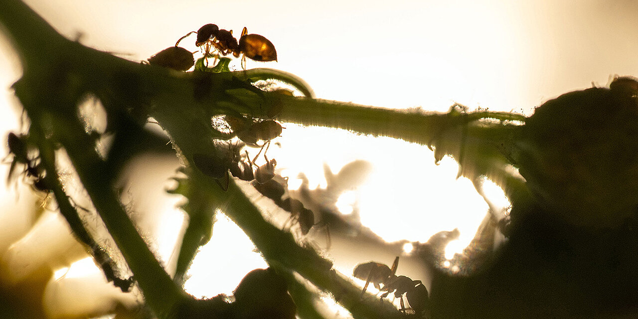 Da passt es sehr gut, dass das beste Pressefoto Unterfrankens 2025 in der Kategorie „Wissenschaft“ ebenfalls Ameisen zeigt. Auf der Aufnahme der Fotografin Pia Bayer sind mehrere Exemplare zu sehen, die über den Stängel einer Pflanze krabbeln und Blattläuse melken, während dahinter die Sonne aufgeht.