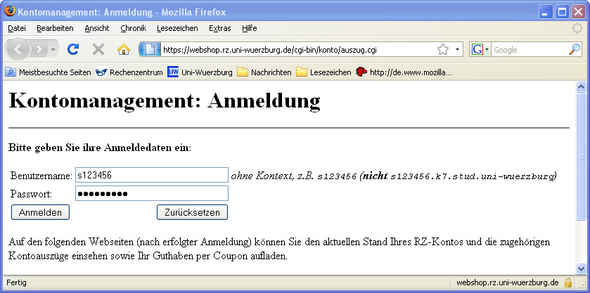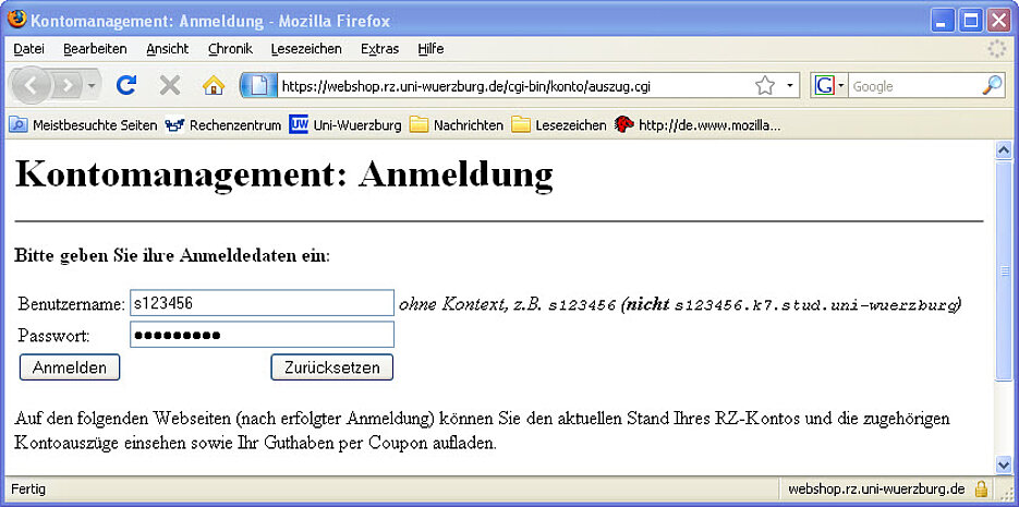 Sobald Sie dort auf "Lastschrift buchen" klicken, wird der angegebene Betrag von Ihrem Bankkonto abgebucht und Ihr RZ-Konto entsprechend aufgeladen.