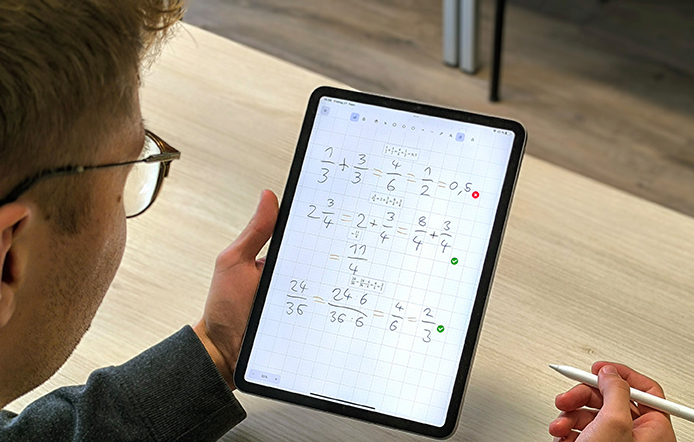 Wie die App funktioniert: Die Lehrkräfte fotografieren Rechenaufgaben ab, eine Software setzt sie sekundenschnell in digitale Arbeitsblätter um, welche die Schülerinnen und Schüler dann handschriftlich auf einem Tablet bearbeiten können. Machen sie bei der Rechnung etwas falsch, gibt ihnen die App sofort Feedback, ohne die Lösung vorwegzunehmen.