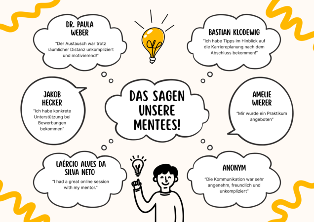 - Mentor*in und Mentee entscheiden zudem über die Art des Austausches und ob der Schwerpunkt z. B. auf einer Orientierungshilfe, der Kontaktvermittlung, die Abschlussarbeit betreffen, der Praktikumssuche oder dem Berufseinstieg liegt.