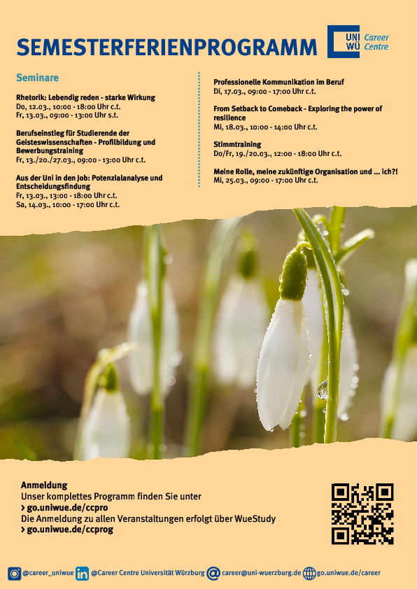 Auch im Wintersemester bieten wir Ihnen wieder verschiedene Vorträge und Infoveranstaltungen an, die Sie bei der Berufsvorbereitung und -wahl unterstützen. Die Anmeldung ist bereits für alle Veranstaltungen über WueStudy möglich.
