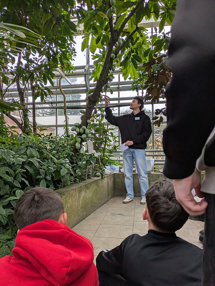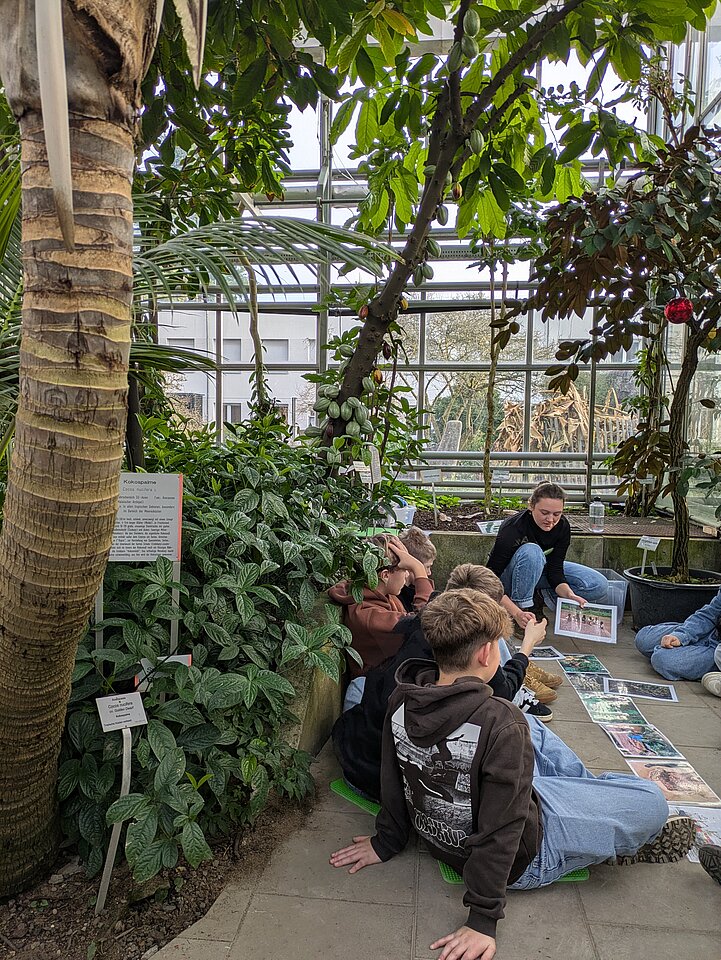 Diesen Fragen gingen die Studierenden gemeinsam mit zwei 6. Klassen nach. Zu Beginn üerlegten die Schüler:innen, was sie denn eigentlich mit der Weihnachtszeit verbinden – dabei wurden ganz unterschiedliche Assoziationen genannt. Anschließend erkundeten die Schüler:innen in Kleingruppen unterschiedliche Bereiche des Gartens. In einer Station untersuchten die Kleingruppen, aus welchen Regionen die Gewürze Vanille, Zimt und Nelken stammen und welche Pflanzenbestandteile zur Herstellung genutzt werden. Dies konnten sie im Gewächshaus direkt an den Pflanzen untersuchen. Der Kakaobaum und die Schokoladenproduktion ermöglichten bei einer weiteren Station, mehr über Arbeitsbedingungen auf den Kakaoplantagen zu erfahren und die Schüler:innen diskutierten die Bedeutung von Menschen- und Kinderrechten in der Produktionskette von Schokolade. Wie eigentlich Weihnachtsbäume angebaut werden, erforschte eine Station im Tertiärwald – und trotzte der Kälte. Die Kleingruppe verglich verschiedene Alternativen zum konventionellen Weihnachtsbaum und erarbeiteten, worauf man beim Kauf eines Weihnachtsbaums achten kann.