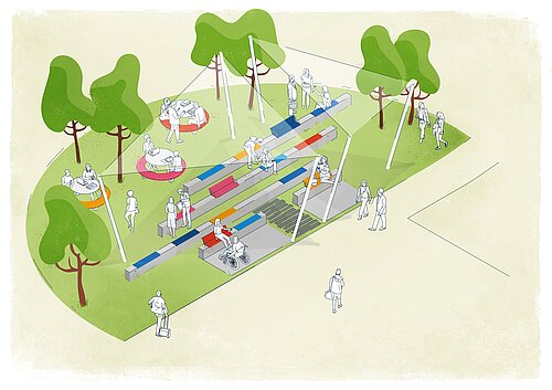 Neben dem kleinen 'Forum im Freien' sollen drei Gruppenarbeitstische zur fachlichen oder interdisziplinären Gruppenarbeit einladen und es den Studierenden ermöglichen, in Kleingruppen zu diskutieren, zu arbeiten oder zu planen.