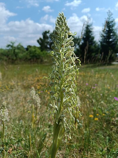 | The Lizard Orchid (Himantoglossum hircinum) is a striking native orchid. It grows in warm, chalky, dry locations such as nutrient-poor grasslands and embankments. It is characterized by its long, spiraled lips and an intense goat-like smell that attracts insects. The plant flowers from May to July and is protected in many regions. It also grows on the Hubland. |