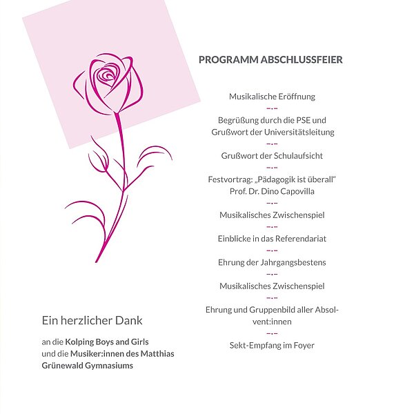 In festlichem Ambiente werden alle Absolventinnen und Absolventen genannt und erhalten eine Rose – die Übergabe des Zeugnisses ist dem Ministerium vorbehalten. Die jeweiligen Jahrgangsbesten einer Schulart werden an dieser Feier noch einmal ganz besonders geehrt.