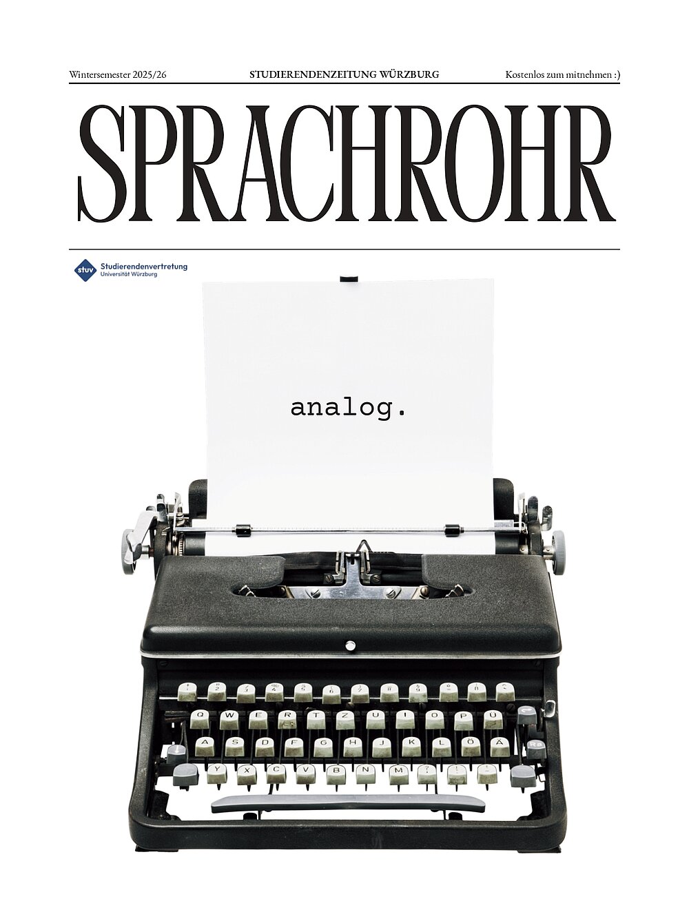 Das SPRACHROHR ist die offizielle Zeitung der Studierendenvertretung, welche in Zusammenarbeit mit dem Studierendenwerk Würzburg herausgegeben wird.