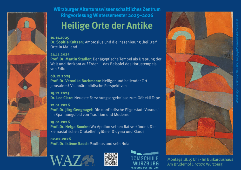 In der Ringvorlesung werden wir heilige Orte aus unterschiedlichen Epochen und Regionen der antiken Welt besuchen. Unsere Reise führt uns von Griechenland bis Indien, vom Alten Ägypten nach Jerusalem und vom prähistorischen Göbekli Tepe ins spätantike Italien.