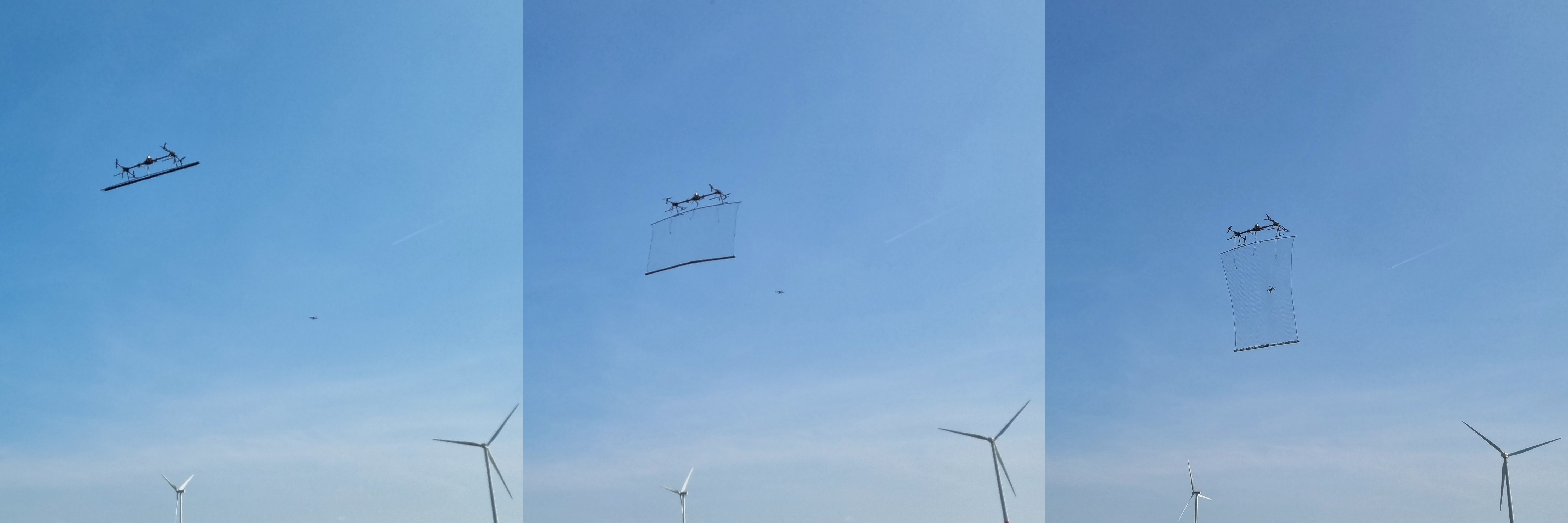 43Drohnen.png Die Abfangdrohne im Zielanflug. Zunächst wird das Netz ausgerollt, dann der Eindringling eingefangen. (Bild: Martin Henriquez Wehr) -