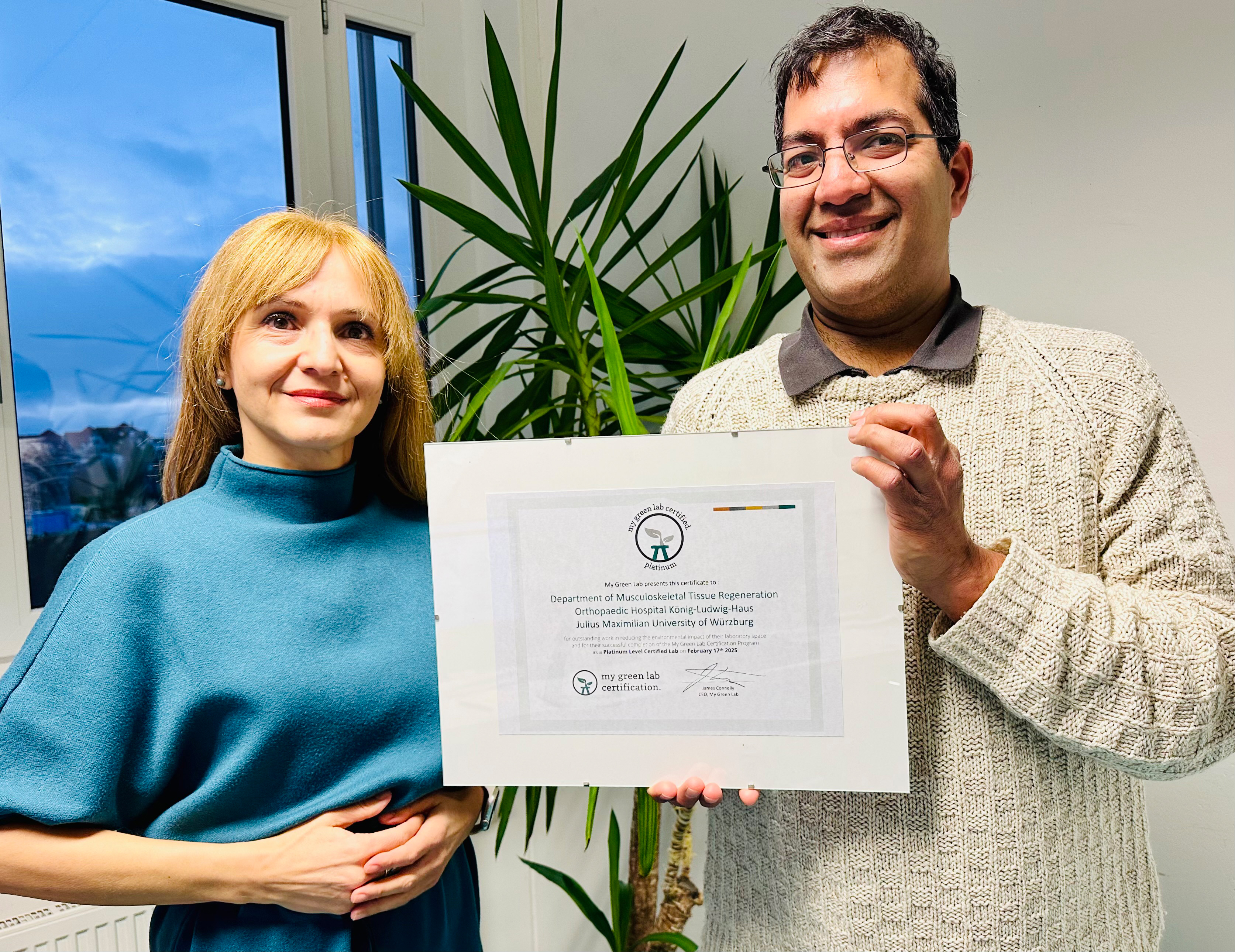 MyGreenLab-FotoEzgiDuman.jpg Professorin Denitsa Docheva und Green-Lab-Beauftragter Dr. Girish Pattappa sind stolz auf die Nachhaltigkeits-Zertifizierung für ihr Labor. (Foto: Ezgi Duman / Universität Würzburg) -
