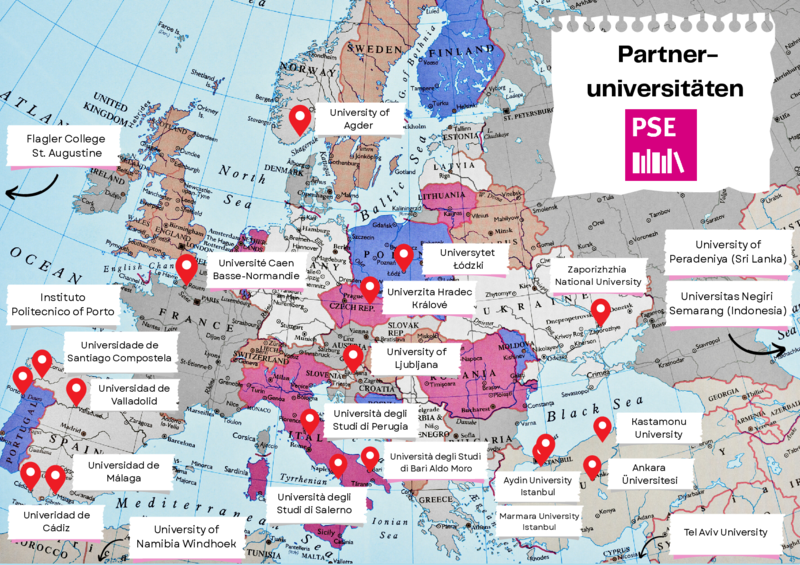 Die Professional School of Education hat im Rahmen des Erasmus+-Programms Kontakte zu zahlreichen Universitäten der Europäischen Union. So bestehen Erasmus-Austauschmöglichkeiten zwischen Würzburg mit nachfolgenden Partner-Universitäten.