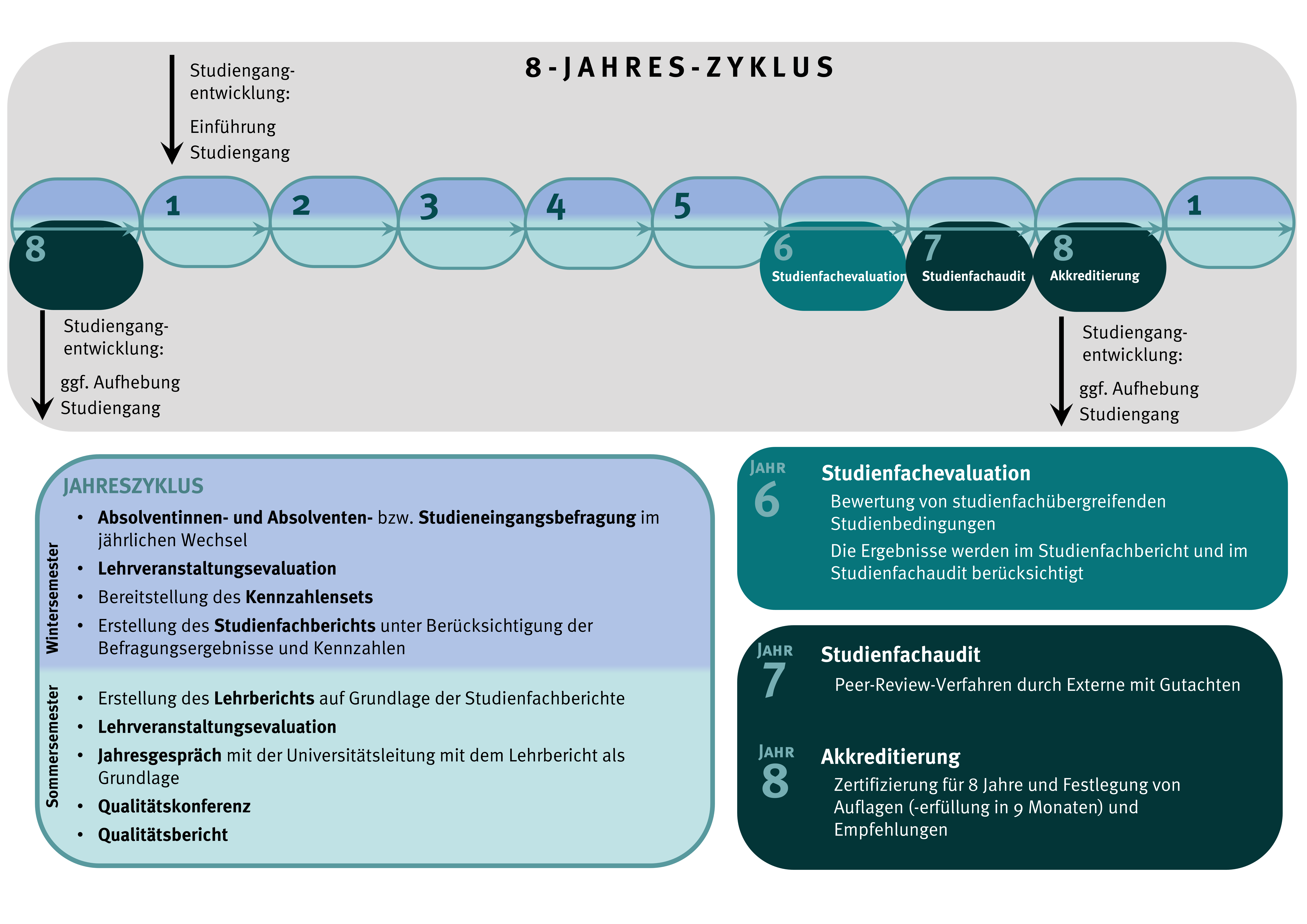 Dem 8-Jahres-Zyklus liegt die Überlegung zugrunde, dass die Universität Würzburg – abweichend von den für Programm(re)akkreditierungen geltenden Zyklen – die Qualität ihrer Studiengänge in jedem Jahr überprüft, eventuelle Fehlentwicklungen entdeckt und zeitnah mit Maßnahmen reagieren kann. Da darüber hinaus alle Studiengänge im sechsten Jahr über die Studienfachevaluation umfassend evaluiert und im siebten Jahr im Rahmen des Studienfachaudits unter Einbeziehung externer Expertise vertieft begutachtet werden, bevor im achten Jahr die Entscheidung über die interne Zertifizierung fällt, werden gründliche Untersuchungen der Studiengänge im Prinzip alle sechs Jahre vorgenommen. Um ausreichend Zeit für die Entwicklung der Studiengänge zu geben, aber auch, um Ressourcen auf Seiten der Fakultäten und Fächer sowie der Verwaltung planvoll einzusetzen, hat sich die Universität darauf verständigt, für das Verfahren der internen Zertifizierung acht Jahre anzusetzen. Daraus ergeben sich durchschnittlich drei bis vier Studienfachaudits pro Jahr und ebenso viele Studienfachevaluationen.