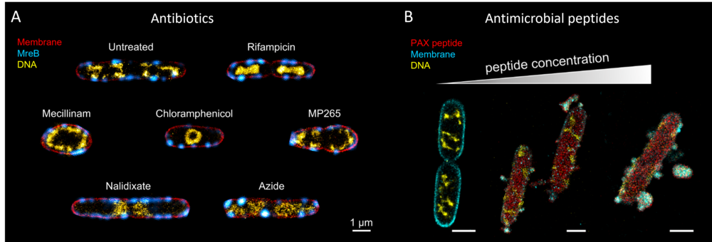 Einige Antibiotika haben beispielsweise einen starken Einfluss auf die Zellform sowie die Verteilung der DNA innerhalb der Zelle (Abb. 4A) [3]. Dies macht man sich in bildbasierter Wirkstoffscreening zu Nutze, in welchem die unterschiedlichen Phänotypen als Indikator für die grobe Wirkungsweise (MoA) von Wirkstoffen dienen können. Wir denken, dass eine stark verbesserte Auflösung eine detaillierte Bewertung der Wirkungsweise von Antibiotika ermöglichen.