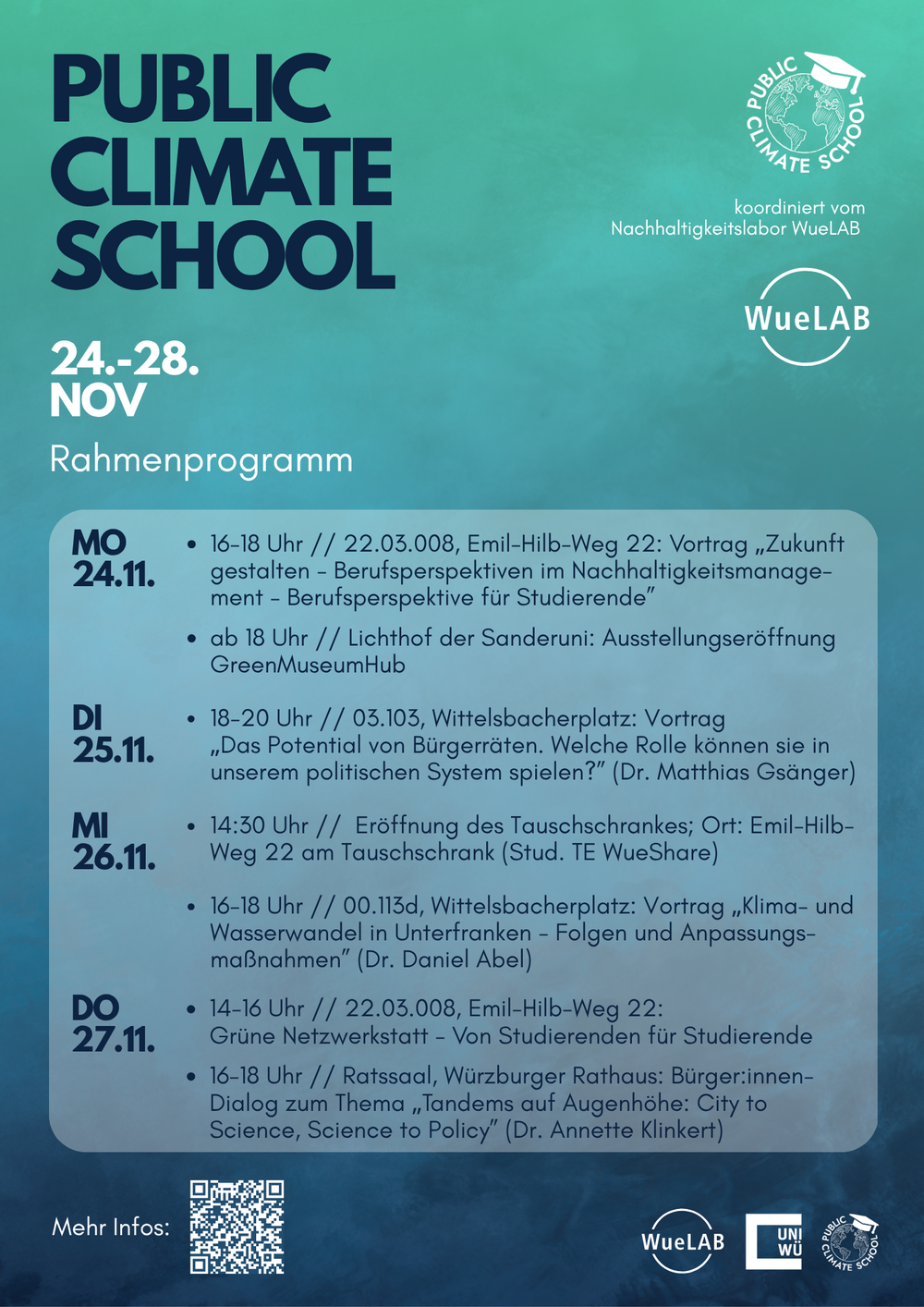 Mit der deutschlandweit stattfindende Public Climate School (PCS) vom 24.-28. November 2025 geht die Region Mainfranken mit der Universität Würzburg und der Technischen Hochschule Würzburg-Schweinfurt einen weiteren Schritt in Richtung Nachhaltigkeit. In der Aktionswoche gibt es jährlich ein interessantes und vielseitiges Veranstaltungsprogramm rund um Klimaschutz und Nachhaltigkeit mit der Möglichkeit, sich damit auseinanderzusetzen und diese auf vielfältige Weise zu erleben. Die Veranstaltungen umfassen spannende Formate, darunter Vorträge, Vernetzungstreffen, Seminare, Planspiele und Workshops, die von Expertinnen und Experten beider Bildungseinrichtungen geleitet werden. Ein besonderes Ziel ist es, diese Themen verstärkt in die Lehre einzubringen. Herzlich eingeladen, an dem vielfältigen Programm teilzunehmen, sind alle Studierenden sowie Angehörige der Hochschule und Universität, aber auch externe Interessierte.